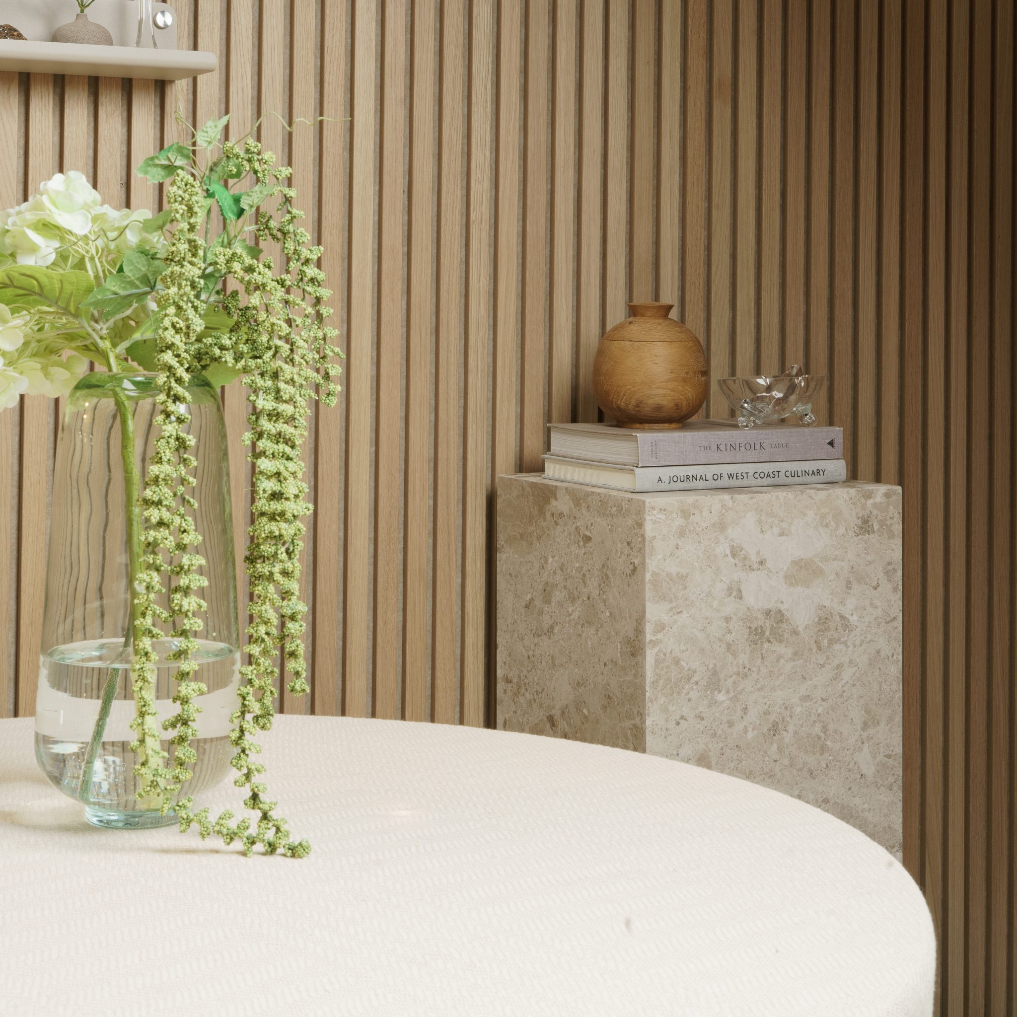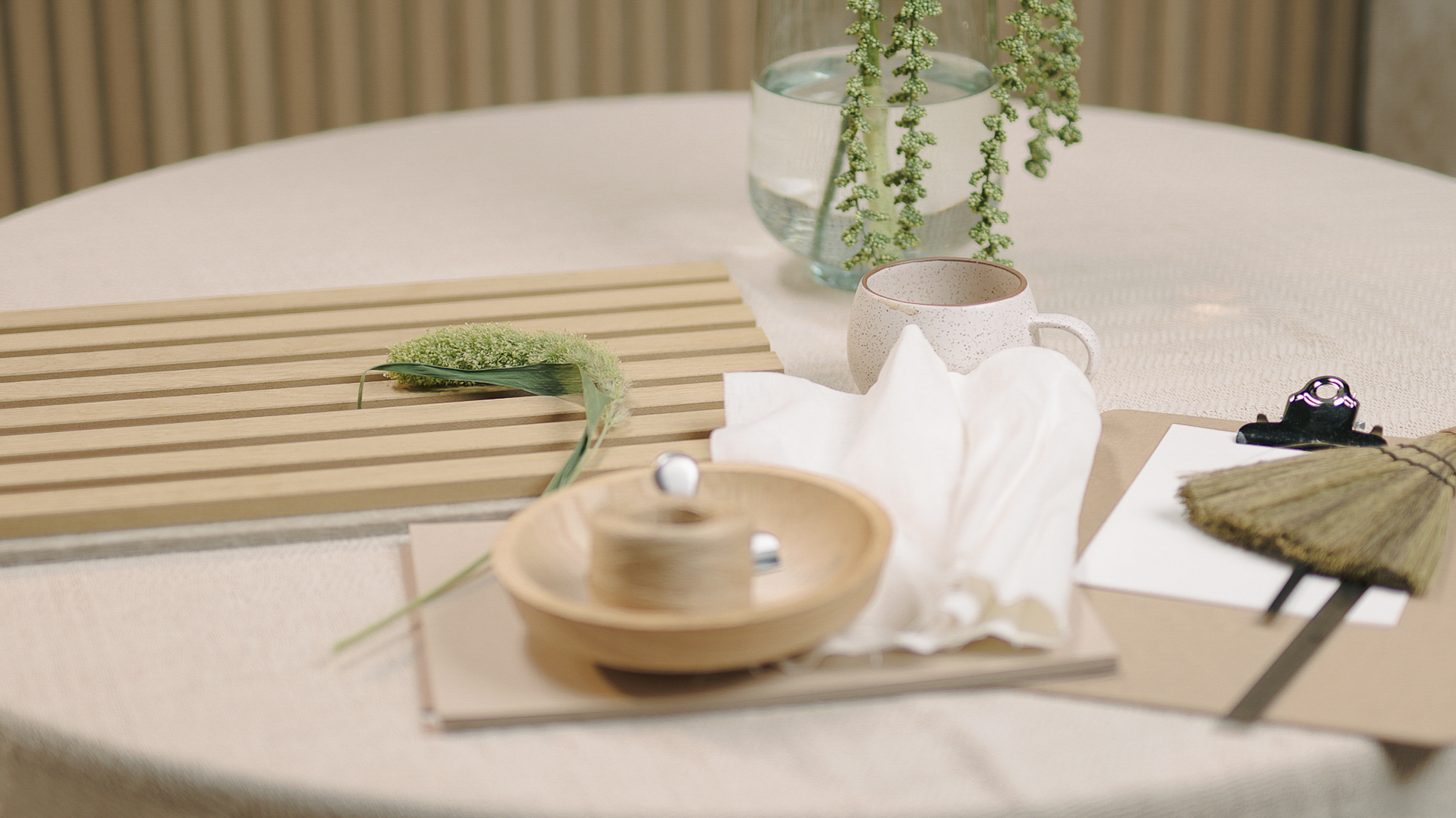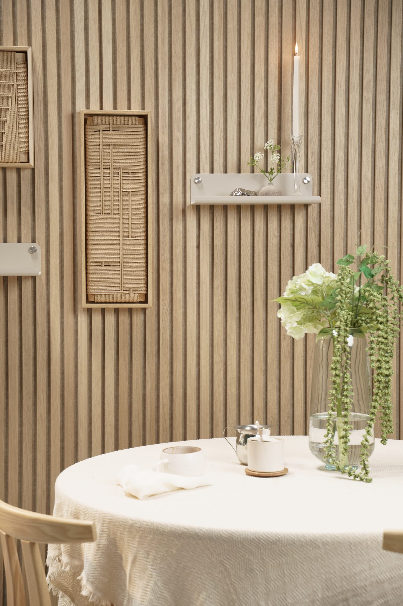 Prueba a incorporar un mantel de lino, una tabla de servir de madera, salvamanteles trenzados o — por supuesto — nuestros paneles acústicos de madera. Estos materiales no solo decoran el espacio — también definen su atmósfera.