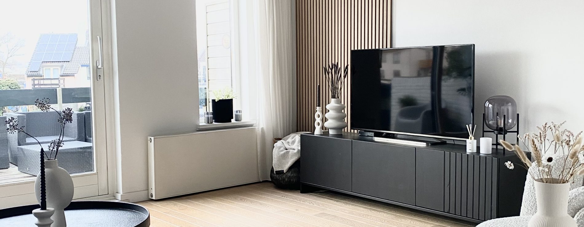 En este proyecto, realizado por Janneke, se eligieron los Akupanel Roble Clásico con fieltro negro. Este color complementa perfectamente los tonos suaves y el suelo de madera clara de la sala de estar.