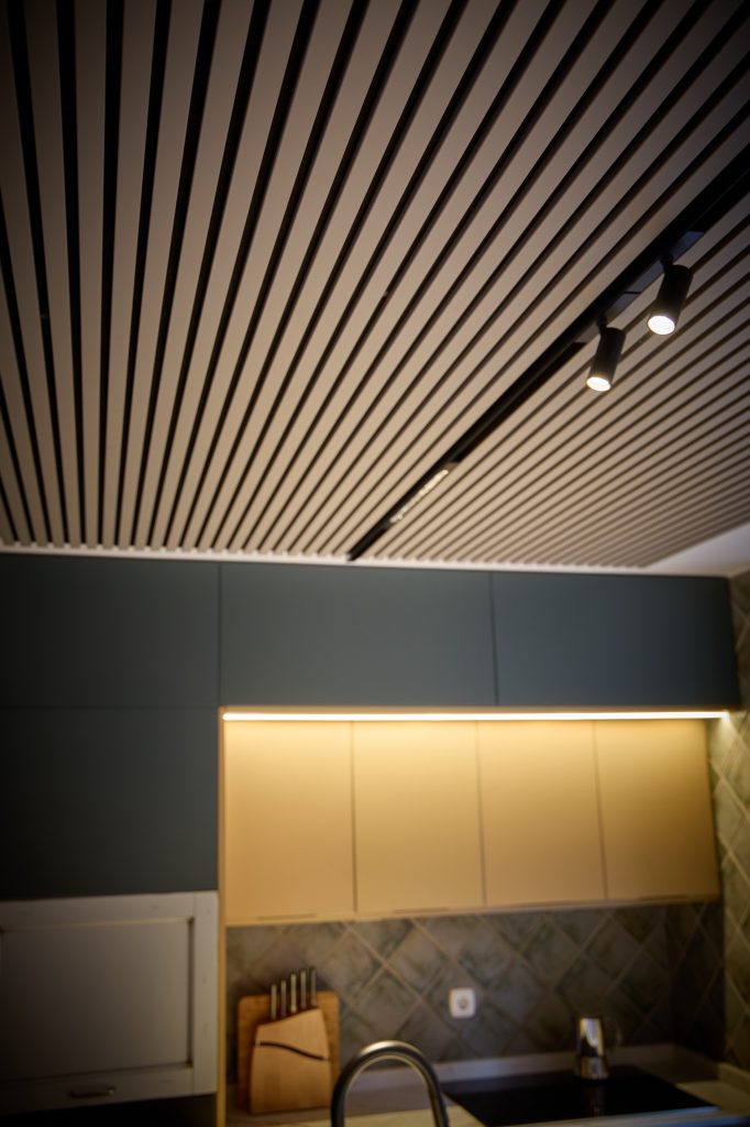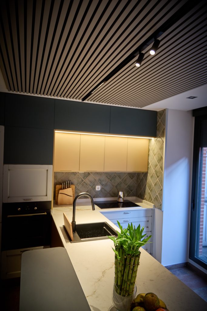 En línea con el compromiso de sostenibilidad del proyecto, se han incorporado los innovadores Akupanel de WoodUpp. Estos paneles, además de aportar una estética moderna y sofisticada, mejoran el aislamiento acústico del espacio, creando un ambiente cómodo y armonioso. Su composición respetuosa con el medio ambiente los convierte en una elección ideal para quienes buscan diseños sostenibles y de calidad.La iluminación, proporcionada por Faro Barcelona, ha sido clave en la transformación del espacio. Gracias al sistema de carril Post Track con tecnología LED eficiente y adaptable, se ha logrado un equilibrio perfecto entre funcionalidad y estética, resaltando cada rincón con una iluminación cálida y confortable.
