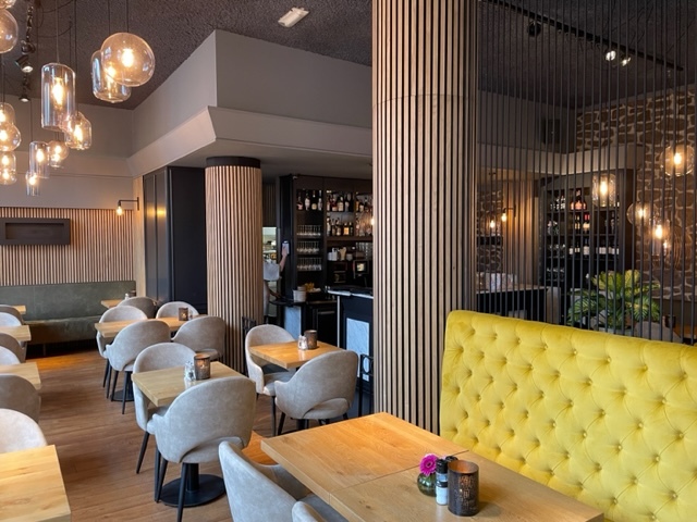Beneficio Clave: Los paneles acústicos de madera pueden instalarse en diferentes áreas del restaurante, garantizando una experiencia óptima tanto en zonas de comida tranquila como en áreas de mayor actividad, como el bar.