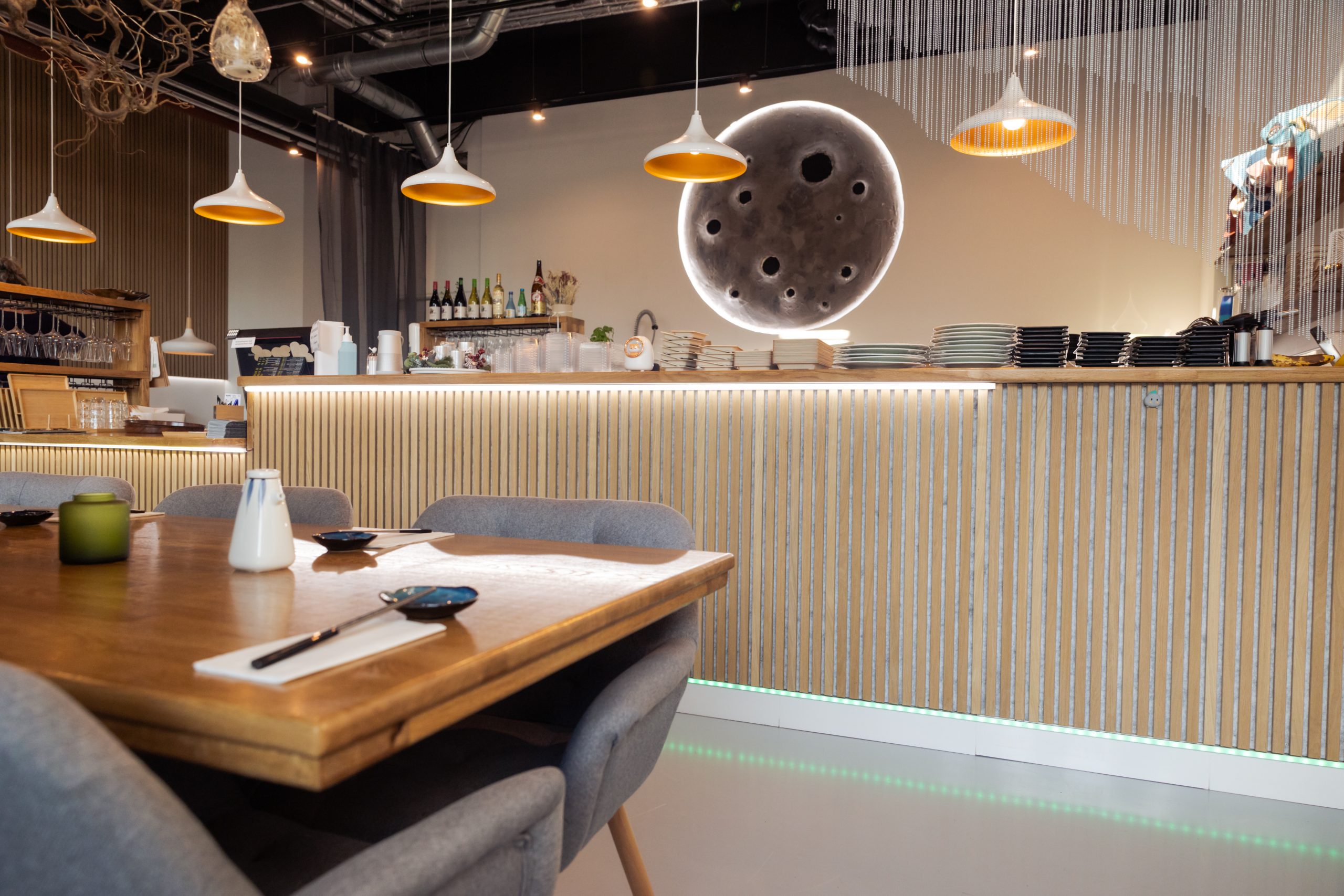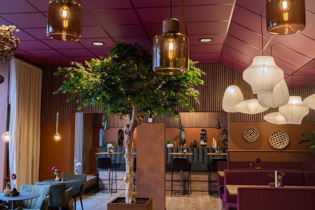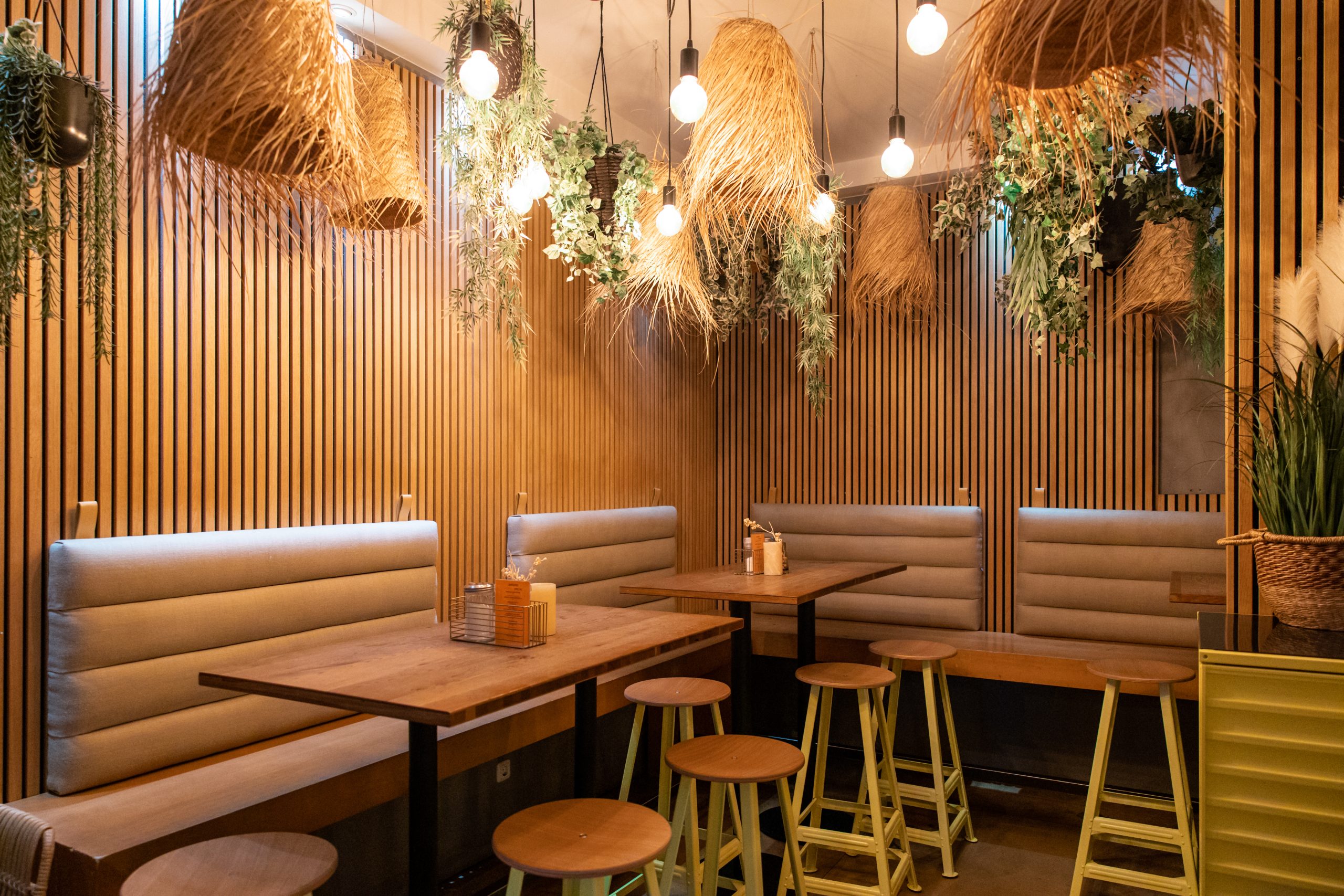 Beneficio Clave: Los paneles acústicos de madera pueden instalarse en diferentes áreas del restaurante, garantizando una experiencia óptima tanto en zonas de comida tranquila como en áreas de mayor actividad, como el bar.