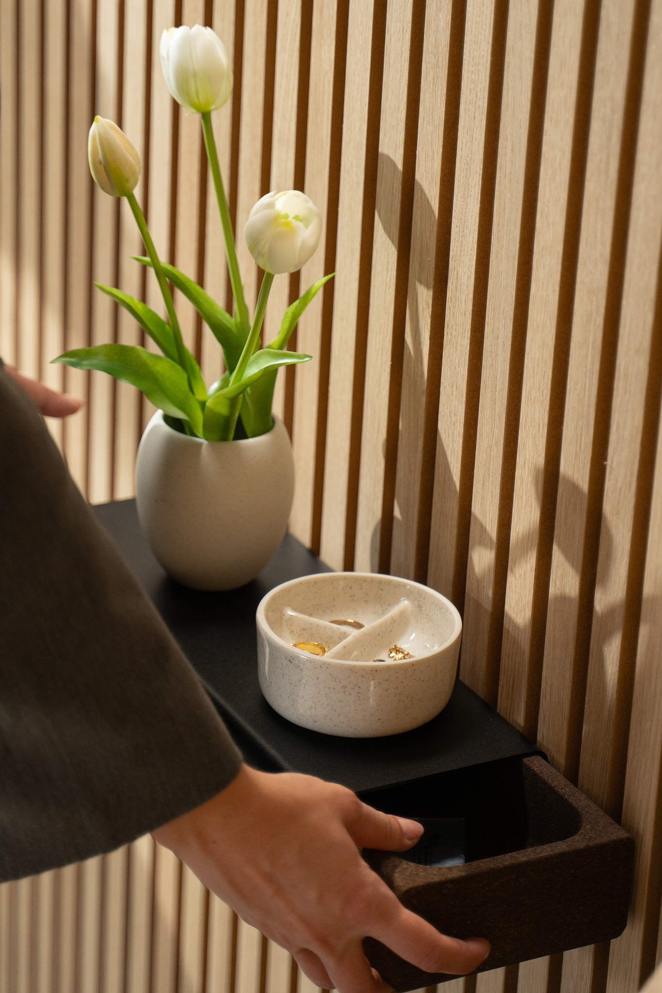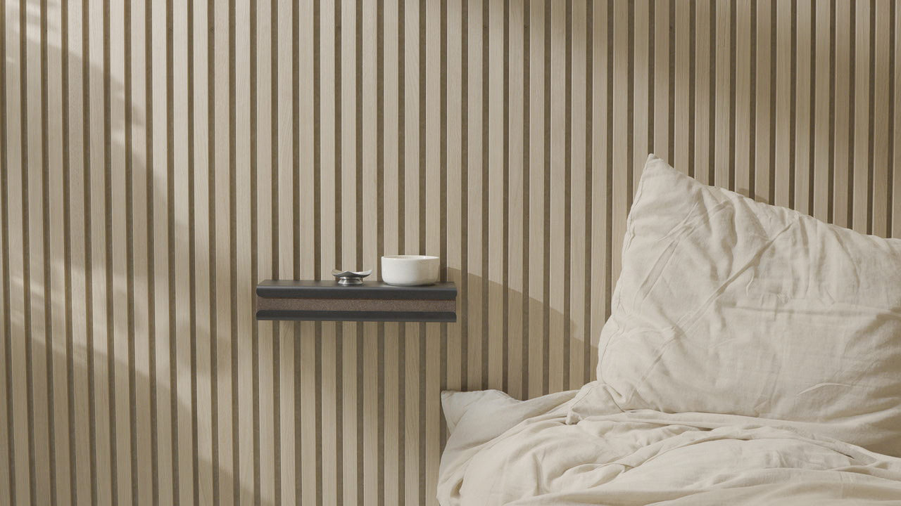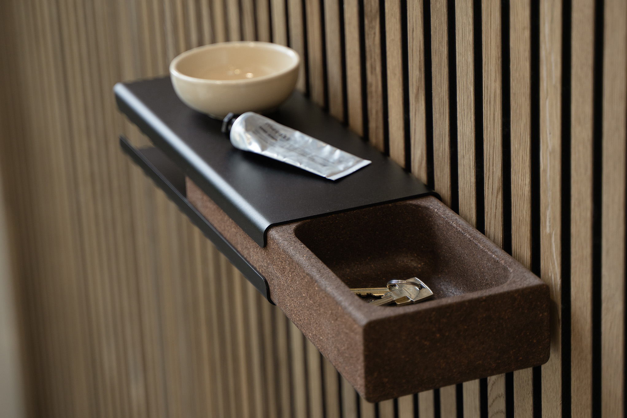 La bandeja para llaves está hecha de acero negro con recubrimiento en polvo y cuenta con un cajón oculto de corcho ahumado. Se monta fácilmente en los Akupanel con los soportes incluidos y mantiene a raya los objetos pequeños del día a día – como llaves, gafas o cargadores – fuera de la vista y sin ocupar espacio extra.